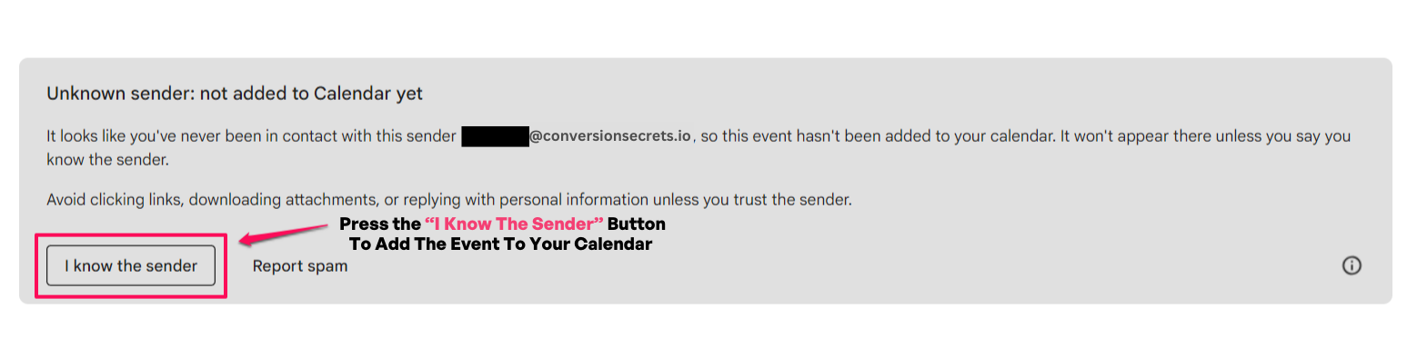 To add the event to your calendar, you need to go to your email, open the email that says "Invitation from an unknown sender" from an @causeacademy.ca domain, and click "I Know The Sender"